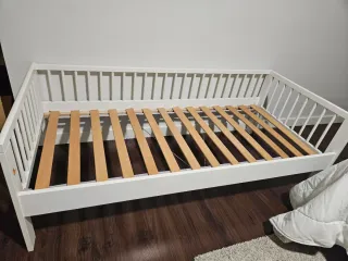 Cama infantil blanca con estructura de madera y barrotes de seguridad. -Se incluye tambien vaya lateral de seguridad. - Diseño moderno y seguro. - Somier de láminas de madera.