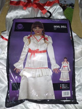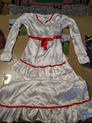 Disfraz de muñeca Anabelle - Vestido blanco largo satinado con detalles rojos. - Mangas acampanadas. - Cinturón y volantes con acabado rojo. -Talla 10 años