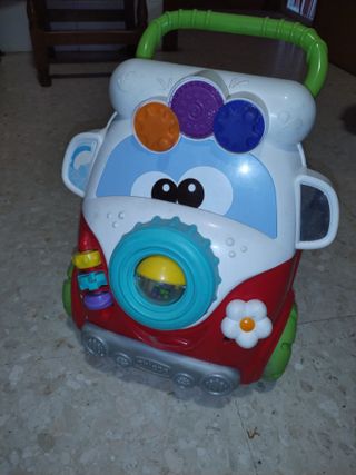 Andador para bebés con diseño divertido de furgoneta. - Mango de empuje. - Ruedas grandes - Colores vivos y alegres. -Andador para ayudar a los bebés a caminar, tiene centro de actividades manuales, incluye espejo, y elementos interactivos para que juegue el bebé que se deslizan y giran.