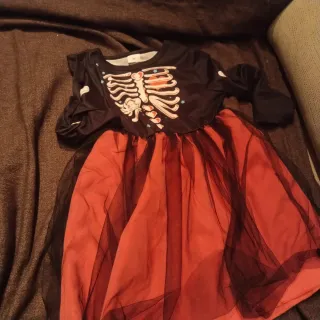 Disfraz de esqueleto para niña, ideal para Halloween o fiestas temáticas. El diseño presenta un estampado de huesos en el torso y una falda de tul. - Talla: 5 años. - Color: Negro y rosa - Material: Poliéster y tul.