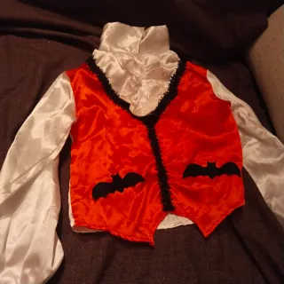 Disfraz de vampiro para niño, ideal para fiestas temáticas o Halloween. Incluye camisa y chaleco. - Camisa blanca con cuello alto y volantes. - Chaleco naranja con detalles negros y murciélagos.