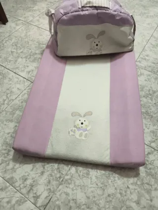 Conjunto de cambiador y bolso para pañales con un adorable diseño de conejito. - Cambiador con detalles en color lila y blanco. - Bolso a juego con estampado de conejito. - Asa para facilitar su transporte.