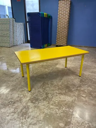 Mesa infantil de color amarillo con patas de metal. Medidas 120cm*60cm Altura 50cm
