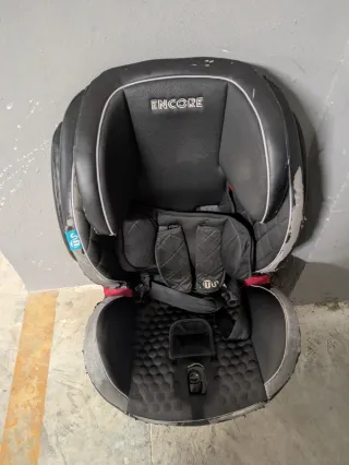 Silla de coche marca ENCORE, en color negro y gris. Diseñada para la seguridad y comodidad. - Tapicería acolchada. - Reposacabezas ajustable. - Sistema de arnés de seguridad.