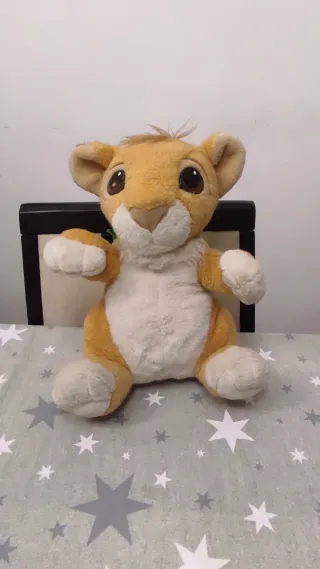 Peluche Simba de "El Rey León"🦁🤗 Cuenta con sistema de voz, cuando le aprietas dice la frase "Voy a ser el Rey"🤩 Tiene muchos años y algún signo de deterioro, pero los más destacables son unos rayajos en los ojos y una cinta cortada en el cuello (ambos daños se aprecian en las fotos)😊 Mide unos 31cm📏