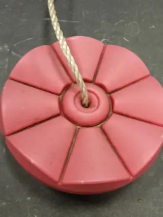 Columpio infantil con un diseño divertido y llamativo, ideal para exteriores. - Disco de color rosa con forma de flor. - Cuerda resistente para colgar. - Apto para uso en jardín o patio.
