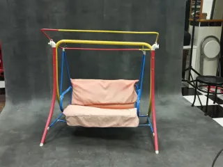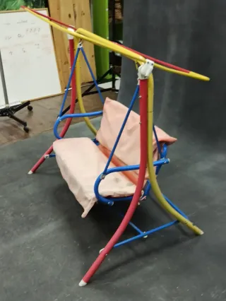 Balancín infantil de colores vivos, ideal para el jardín o patio. - Estructura metálica resistente. - Asiento acolchado. - Diseño colorido y divertido. Falta tela de la parte de arriba.