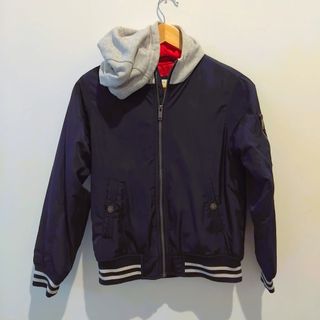Cazadora azul de la marca Kids Collection con capucha. En color azul con la capucha en color gris. Tiene en la etiqueta escrito un nombre (ver fotografías). - Cierre de cremallera. - Puños y bajo elásticos con rayas blancas. - Bolsillos laterales con botón. - Detalle de parche en manga. - Talla 11-12 años (152cm) Más artículos en mi perfil***