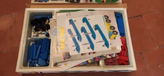 Set de construcción Lego 744 de los años 80. Incluye un motor de 4.5 voltios. - Vehículo todoterreno con antena. - Grúa con bola de demolición. - Molino de viento. - Vehículo de carga.