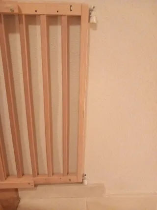 Barrera de seguridad de madera para escaleras o pasillos. - Fabricada en madera clara. - Diseño de listones verticales.