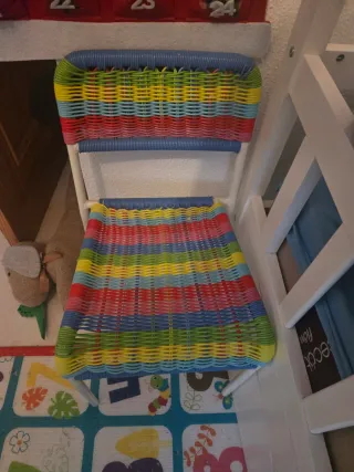 Silla infantil con un diseño alegre y colorido, perfecta para habitaciones infantiles o zonas de juego. Su estructura es de mimbre sintético trenzado en vivos colores. - Estructura de mimbre sintético. - Diseño de rayas multicolores. - Asiento y respaldo cómodos.