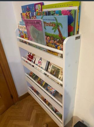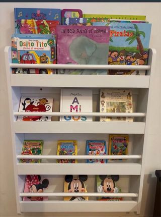 Práctica librería infantil de estilo Montessori con cuatro estantes para organizar libros. - Diseño de madera blanca. - Ideal para habitaciones infantiles.