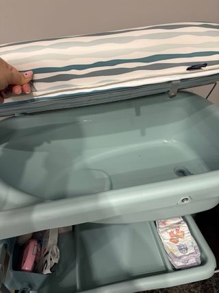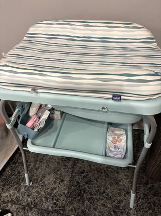 Bañera cambiador de la marca Chicco con un diseño moderno y funcional. Incluye una cubeta para el baño y una bandeja inferior para tener todo a mano. - Colchoneta cambiador con estampado de rayas. - Bandeja de almacenamiento. - Cubeta integrada para el baño del bebé.