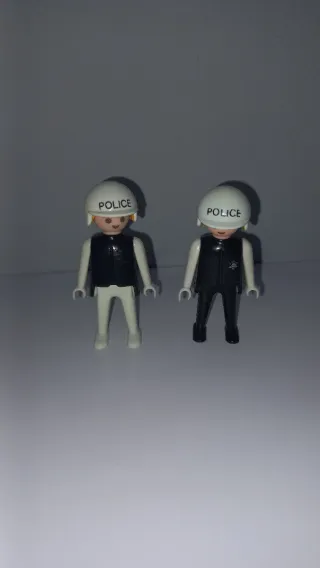 Dos figuras de Playmobil de policía. Incluyen 3 cascos con la palabra POLICE - Una figura con uniforme blanco y chaleco negro. - Otra figura con uniforme negro y chaleco negro con insignia. En el perfil hay mas figuras playmobil para hacer tus propios lotes y ahorrar en el envío. Se escuchan ofertas.