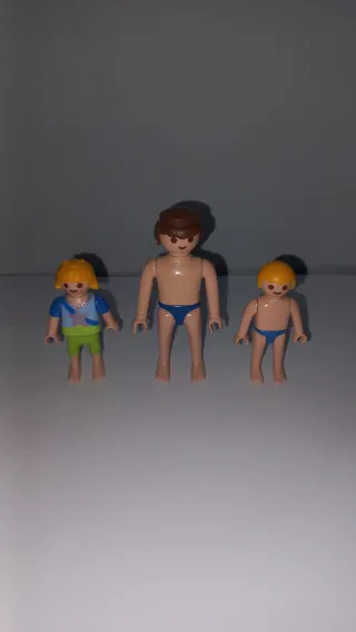 Lote de tres figuras Playmobil vestidas con bañador. - Figura de adulto con bañador azul. - Figura infantil con bañador azul. - Figura infantil con camiseta playera y pantalón verde. En el perfil hay mas figuras playmobil para hacer tus propios lotes y ahorrar en el envío. Se escuchan ofertas.