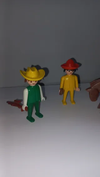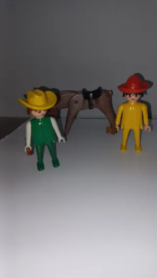 Set de figuras Playmobil con un caballo y dos personajes. - Un personaje con sombrero de vaquero amarillo y chaleco verde. - Un personaje con sombrero mexicano rojo y traje amarillo. - Caballo marrón con silla de montar negra. El caballo tiene la cola rota pero se puede arreglar (ver imagenes) En el perfil hay mas figuras playmobil para hacer tus propios lotes y ahorrar en el envío. Se escuchan ofertas.
