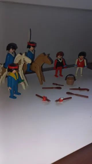 Lote de figuras Playmobil de indios y caballos, ideal para coleccionistas o para jugar. - Incluye 5 figuras de indios. - Incluye 2 caballos, uno blanco y otro marrón. - Accesorios como cubos y armas. En el perfil hay mas figuras playmobil para hacer tus propios lotes y ahorrar en el envío. Se escuchan ofertas.
