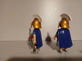 Dos figuras de Playmobil representando cónsules romanos. Ideales para coleccionistas o para recrear batallas históricas. - Figura con casco negro y capa azul. - Figura con casco dorado y capa morada. - Incluyen accesorios como escudos y espadas.
