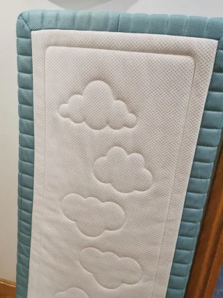Colchón de muy buena calidad para maxicuna o cama infantil, con un diseño de nubes. Comprado en Maxcolchón hace menos de un año, como aparece en las imágenes. Incluyo sábanas. Si necesitas la estructura de la cama, la tengo a la venta también en mi perfil. - Medidas: 70x140 cm. - Incluye juego de sábanas, tanto de invierno como verano. Sábana impermeable y funda nórdica