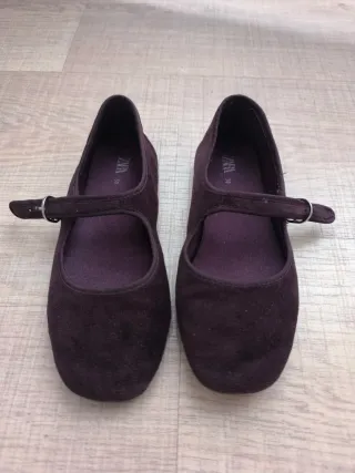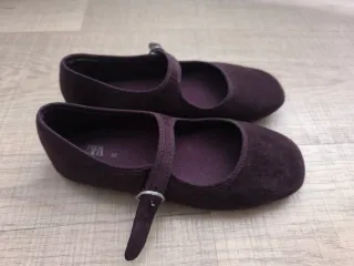 Merceditas de ante en color vino, talla 30. Utilizadas únicamente para una ceremonia. - Cierre con hebilla. - Detalle de tira.