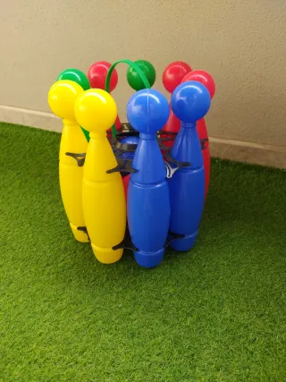 Divertido juego de bolos de plástico para niños. Incluye varios bolos de colores y una base para organizarlos. - Bolos de colores: rojo, azul y amarillo. - Base de plástico negro. - Asa para transporte. -Dos bolas