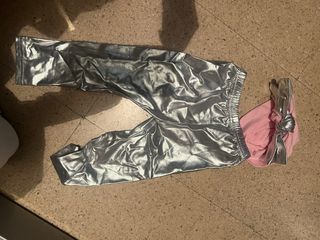 Conjunto de pantalón plateado brillante y pieza rosa con lazo. - Pantalón con cintura elástica. - Tejido plateado con acabado metálico. - Detalle de lazo en color rosa y plateado.