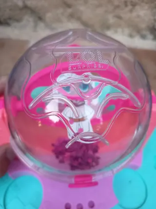 Juguete de la marca LOL Surprise. - Diseño transparente con detalles en rosa y turquesa. - Figura de muñeca en el interior. - Base con elementos decorativos morados.