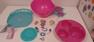 Lote de muñecas LOL Surprise con varios accesorios. - Incluye 4 muñecas LOL Surprise. - Varios accesorios como biberones y un perrito. - Arenero para perro gato con Tapa de LOL Surprise con huellas.