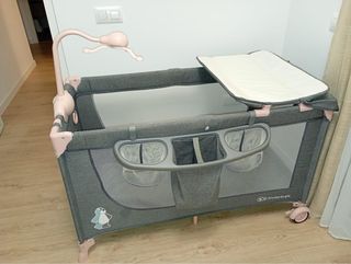 Parque cuna de la marca Kinderkraft en color gris con detalles en rosa. Incluye cambiador y organizador. - Cambiador acoplable. - Organizador lateral con compartimentos. - Móvil de juegos. - Ruedas para facilitar el transporte.