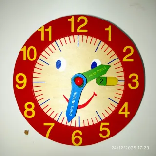 Reloj de madera infantil, muy colorido y perfecto para aprender las horas. Ideal para los más pequeños. - Diseño con cara sonriente. - Manecillas de hora y minuto. - Números grandes y coloridos.
