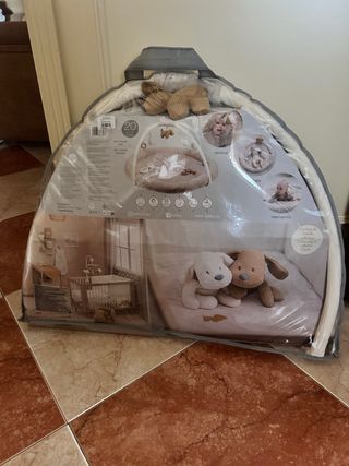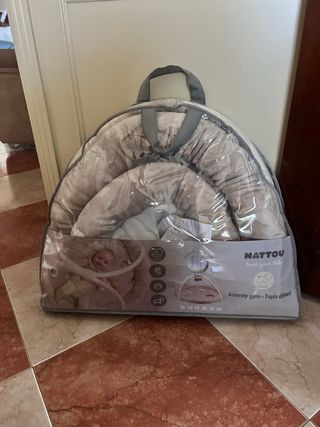 Alfombra de juegos evolutiva Natto Baby en tonos marrones, ideal para el desarrollo del bebé. - Incluye arco de juegos con peluches. - Múltiples texturas y actividades. - Apta desde el nacimiento. Comprado en el Corte Ingles, 109€ usado 1 mes
