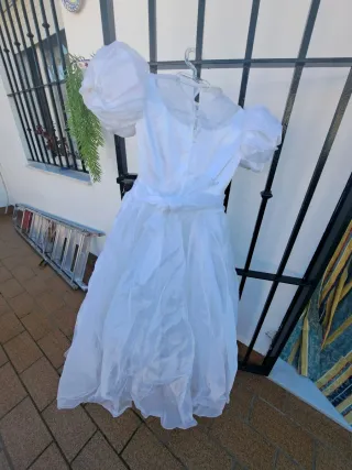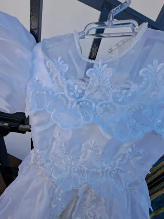 Traje de comunión en buen estado, con detalles de perlas y encaje. - Color blanco. - Diseño con cuello alto y mangas abullonadas. - Adornos de encaje y perlas en el corpiño y la falda.