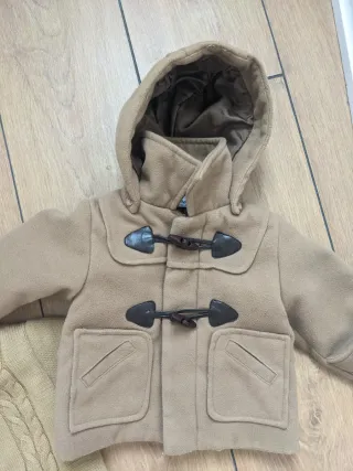 Lote de dos abrigos para bebé. - Abrigo de punto color camel con trenzas y botones. - Abrigo tipo duffle coat color camel con capucha y botones. - Ideales para mantener abrigado al bebé.