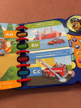 Libro interactivo de la Patrulla Canina de VTech en Español. - 14 páginas con contenido educativo sobre letras , lectura, palabras y música. - Botones luminosos de colores y botones de personajes . - Estimulan aprendizaje con l voz de Chase y una narrador - Incluye personajes de la Patrulla Canina. - Diseño colorido y atractivo. - Botones para interactuar.