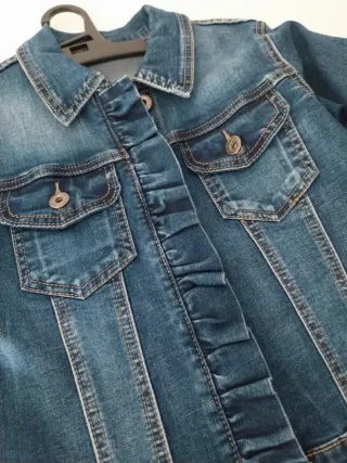 Cazadora vaquera para niña con un diseño moderno y detalles de volantes. - Estilo vaquero clásico. - Adorno de volantes en la parte frontal. - Talla 8.
