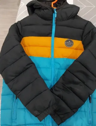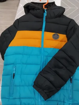 Anorak infantil de la marca Rip Curl. - Diseño acolchado. - Combinación de colores negro, naranja y azul. - Cremallera frontal. - Bolsillos con cremallera.