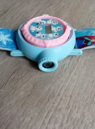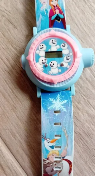 Reloj proyector con temática de Frozen. Presenta un diseño divertido con personajes de la película. - Correa con estampado de copos de nieve y personajes. - Esfera con figuras de muñecos de nieve. - Detalles en color rosa.