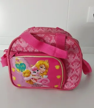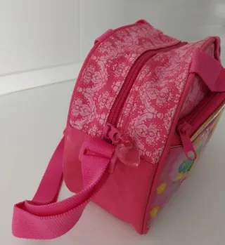 Bolso infantil de color rosa con estampado de Princesas Disney. - Diseño con Aurora y su mascota. - Estampado floral en relieve. - Asa de transporte. - Bolsillo frontal con cremallera.