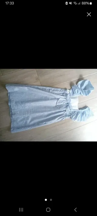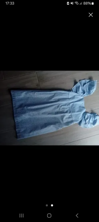Vestido de niña de la marca Dolce Petit, talla 12. Ideal para ocasiones especiales. - Diseño a rayas azules y blancas. - Estilo off the shoulder con volantes. - Lazos decorativos en la parte delantera.