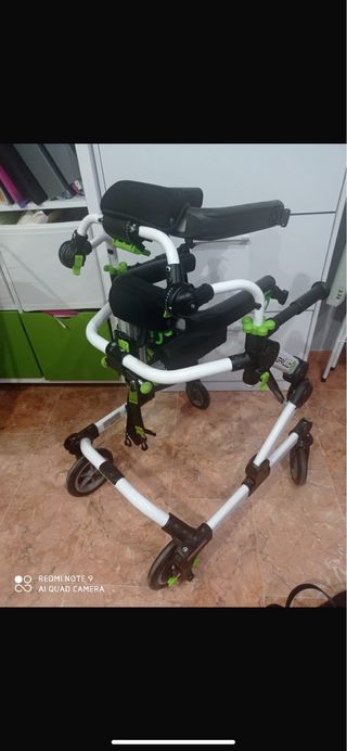 Andador pediátrico marca Grillo, talla S. Diseñado para ofrecer soporte y movilidad. - Estructura blanca y verde. - Asiento y soportes acolchados en negro. - Ruedas para facilitar el desplazamiento.