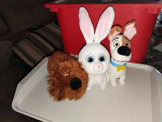 Set de peluches de la película Mascotas. Incluye a Max, Pompón y Duque. - Peluche de Max, el perro terrier. - Peluche de Pompón, el conejo blanco. - Peluche de Duque, el perro de pelo marrón.