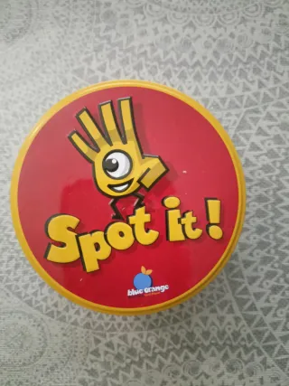 Juego de mesa Spot it!. Un divertido juego de observación y reflejos. - Incluye caja metálica. - Diseño circular con borde amarillo y fondo rojo. - Ilustración de una mano amarilla con ojo y boca sonrientes. - Texto Spot it! en letras amarillas. - Logo de blue orange con un arándano azul. Juego para niños y adultos, para todas las edades. A partir de los 8 años. Esta muy bien. Tiene todas las piezas. Instrucciones en Ingles. Se vende porque mis hijos ya son "mayores" para jugar conmigo.