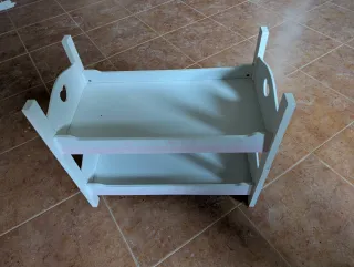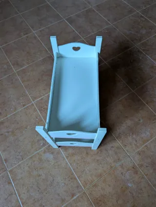 Cama de juguete de madera pintada en blanco, con un diseño encantador. - Cabecero con forma de corazón. - Laterales con aberturas. - Ideal para muñecas o peluches.