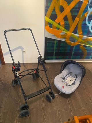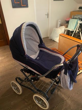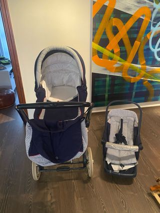 Conjunto de carrito de bebé y silla de coche de la marca Jane. El carrito tiene un capazo espacioso y la silla de coche es adaptable. - Carrito de bebé con capazo. - Silla de coche. - Diseño a rayas y azul marino. solo venta en persona