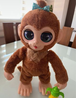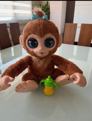 como nuevo. Mono interactivo Peanut, un juguete tierno y divertido. - Incluye biberón. - Ojos grandes y expresivos. - Lazo azul en la cabeza.