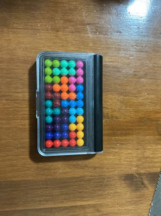 Juego de lógica con cuentas de colores para ejercitar la mente. - Diseño compacto y portátil. - Variedad de colores vibrantes: verde, turquesa, rosa, naranja, morado, azul y amarillo. - Estructura transparente con borde negro.