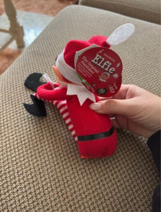 Este travieso elfo navideño está listo para traer alegría a tu hogar. Con su traje rojo y blanco, es un clásico de la temporada. - Atuendo de elfo con gorro. - Pantalones a rayas rojas y blancas. - Botas negras. - Cinturón negro con hebilla.