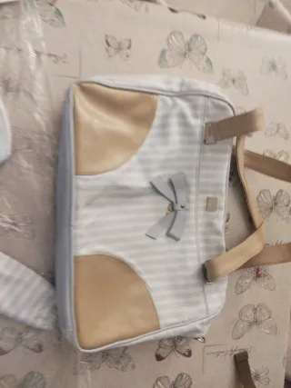 Bolso maternal de la marca Mico's, con un diseño a rayas y detalles en cuero. - Diseño a rayas blancas y celestes. - Aplicaciones de cuero sintético en forma de semicírculo. - Adorno de lazo celeste. - Dos asas de cuero sintético.