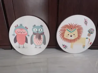 Set de dos cuadros decorativos infantiles con diseños de animales. - Un cuadro con dos búhos con gorro y bufanda. - Otro cuadro con un león con adornos tribales. - Diseños coloridos y alegres.