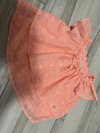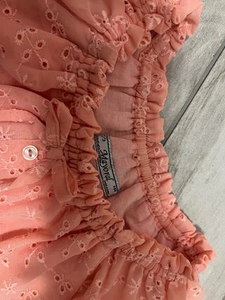 Camiseta de verano de la marca Mayoral, con un bonito diseño. - Color coral. - Tejido ligero con bordados florales. - Cierre de botones en la parte delantera. - Volantes en las mangas.